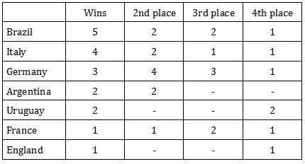 As we get to the final stages of the World Cup it’s worth looking at the track records of the major football nations. To hear the hullabulloo from the losing English camp one would think England was one of them but actually it has only made the last four twice (one win and one 4th place). This compares with the other six winners as follows: