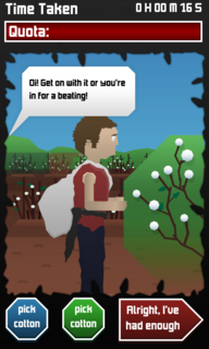 The only game that really works is My Cotton Picking Life, a response to the news that Uzbekistan uses forced labour for its cotton harvest. The dullness and monotony of the game are the whole point: it takes as long to pick a day’s quota of cotton in the game as it does in the fields (though the simulation is obviously a lot less backbreaking than the real thing). I challenge anyone to keep clicking at it for more than 15 seconds.