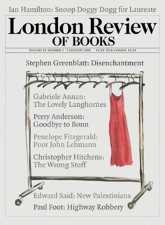 It is hard to believe that soon there will be paintings that aren’t by Peter on the cover. It’s only now when we explain to other people how the covers worked that we realise how spoiled we were. From time to time Peter would come into the office with a batch of watercolours under his arm, three or four in a big folder – ‘I’ve got some covers for you’ – and go away before we looked at them. Usually there was one in the batch that Peter knew we wouldn’t like: a figure, often a woman, often blonde with an air of the 1950s about her, almost always half-asleep. Sometimes it wasn’t a woman but a man, say, with a flower in his hand, and those too we had trouble with. Peter would bring in the original drawing and a mock-up with words from a previous issue to show where the new words should go. Understandably, he didn’t like the words – not the words we had chosen: any words at all – and there was an unstated war between covers (like the present one) that couldn’t accommodate words and covers that were all words – as sometimes they had to be. Every other Thursday afternoon we would choose the cover for the next issue. The considerations were simple: season (no beaches in winter, no bare trees in summer); general appropriateness (no ice-cream sundaes in wartime); and how many pieces had to be signalled on the cover. Sometimes a cover would hang around for a year and suddenly find favour. There’s one in the drawer now: a yellow coach parked at night beside a dark forest. I find it scary and keep taking it out and putting it back. The only literal connection I remember between a cover and the content was in an issue with the piece by Jenny Diski that eventually became her book Skating to Antarctica: Peter did a wonderful painting of the moon in its successive movements, rising and falling over a polar landscape. That may have been a pure coincidence (nobody can remember) and in any case the piece advertised on the rubric – it was the first issue of 1997 – was Alan Bennett’s ‘What I did in 1996.’ One thing Bennett didn’t do was skate to Antarctica.