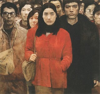 First to the revisionists, survivors of the Cultural Revolution known as Scar artists, who used socialist realism to assess the extent of the damage. In a study of a young woman standing under the eaves of a house – swallows on the wing, wild flowers at her feet, a straw hat hung from the wall – Wang Hai (b. 1955) makes a cool, ambivalent appraisal of student rustication: in this otherwise innocent, even sentimental canvas, we begin to discern a young exile from the city, one of millions banished to rural areas. Students are also the subject of a breathtaking narrative oil painting by Cheng Conglin (b. 1954) which dramatises the return to an exam curriculum in 1977, the year after Mao’s death. Wang’s Spring was painted in 1979; Cheng’s Summer Night: The Days of Restoring the College Entrance Examination was finished in 2009 and gives Scar art a respectable claim to longevity. (Scar literature, so-called after a story by Lu Xinhua in 1978, was short-lived, but recycled post-mortem in works like Wild Swans, aimed over the heads of mainland readers at the international market.)