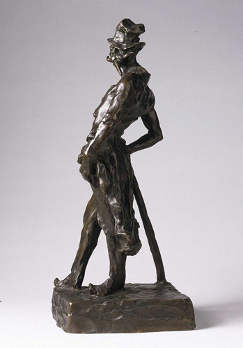 In between, Daumier’s mind-sculptures exchanged weight for dynamism. The Fugitives relief of 1848 or thereabouts shows the heroic nude entering his repertoire: in no way a careerist yet dreamily ambitious, he would have drunk up the comparisons to Michelangelo that critics have since invoked. But already he was looking beyond that schema, starting to conceive each figure as a verb (climb, carry, fall etc): an inclination in space given transient visibility. Wonderful pen drawings from his middle age bring out the attitudes of clowns or lawyers from seedbeds of freely wandering line, wash being gently applied to the paper wherever body volume or body interactions suggest themselves. He seems to home in unerringly on those inner prototypes, so sure in poise, so empathetically inhabited.