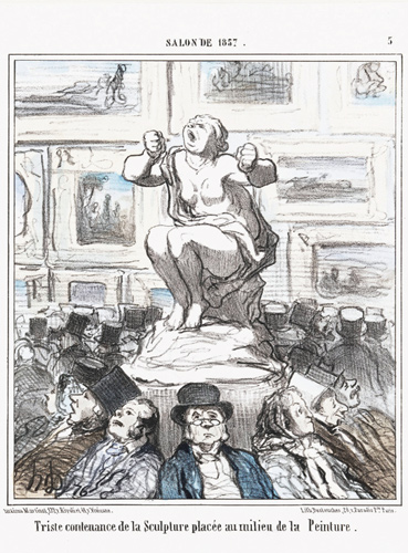 A Daumier lithograph of 1857 shows a marble statue on a plinth coming alive in the midst of the busy Salon. She clenches her fists and bawls in sheer frustration. No one hears her. No one sees her – and that is the reason for the ‘triste contenance de la Sculpture’, as the caption has it. In an out-turned circle, the top-hatted Parisian art-lovers turn their backs on the plinth, gawping instead at the paintings packed dado to ceiling on the Salon’s walls. Eleven years earlier, in his ‘Salon de 1846’, Baudelaire had sardonically wondered ‘why sculpture is boring’. Three-dimensional manufacture – ‘brutale et positive comme la nature’ – satisfies only hicks and savages, the critic suggested. More advanced minds will not be content with objects that can be approached from all angles and thus fail to supply us with a personal artistic viewpoint. Painting, with its single perspective, ‘exclusive et despotique’, is more properly the language of the imagination.
