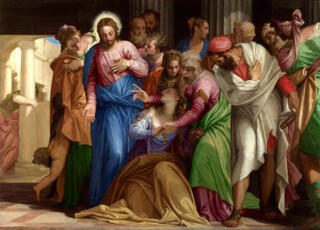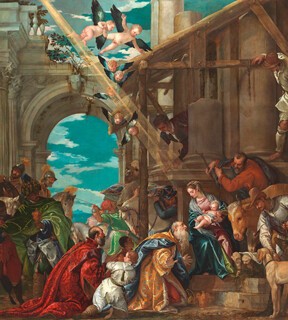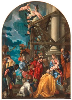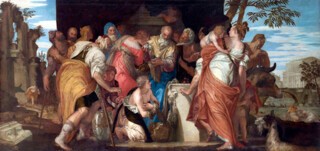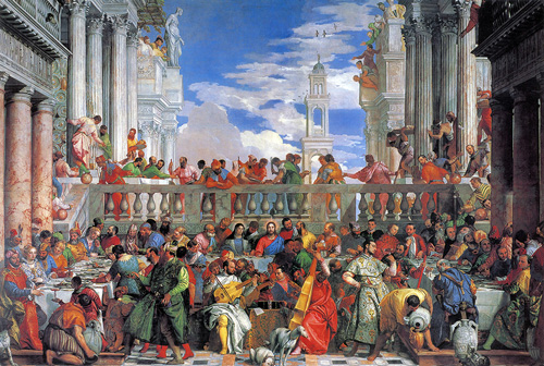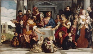 Inevitably, there are no examples of the type of picture for which Veronese is best known, his depictions of religious feast scenes, such as the Marriage at Cana in the Louvre. These works are too large to travel, but the Supper at Emmaus from the Louvre to some extent makes up for this, although it is a strange and not entirely successful work, untypical in the inclusion of about 15 members of an unidentified family gathered around the central group of Christ and the disciples, who are oddly smaller than a man serving them at table. Its appearance has not been improved by a radical and insensitive recent restoration.