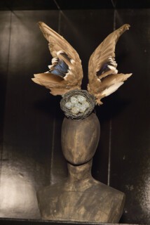 Savage Beauty is shadowed by the story of McQueen’s life, his troubled psyche, and eventual suicide. McQueen once called himself ‘a romantic schizophrenic’ and Bolton takes Romanticism as his organising principle: each section offers a variation – Romantic Primitivism, Nationalism, Tribalism, Exoticism, Naturalism – and wraps the visitor in a total scenario: gorgeous tarnished and gold-framed Venetian mirrors in one room, a dim mortuary cave entirely lined with bones in another, and throughout a shimmering and ravishing soundscape of layered sampling and electronics created by John Gosling (aka Mekon). Bolton avoids the term ‘gothic’, but it haunts the show.