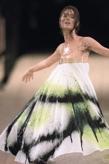 McQueen showed a very early gift for making clothes – as well as a taste for bodily discipline (he enjoyed synchronised swimming with his sisters). He was apprenticed in his teens to a tailor on Savile Row and learned to cut patterns for the high end of the gentleman’s market; his spontaneous dash with the scissors astonished – and alarmed – the team at Givenchy in Paris when he arrived there, and his tailoring skills mark the wonderfully elegant suits and outfits on show in the first rooms of the exhibition. After Savile Row, he went to work for theatrical costumiers, and continued to take off into different eras and places, reprising Jacobite jabots, tartans and sashes (in the collections ‘Highland Rape’ and ‘The Widows of Culloden’), Noh theatre, Swan Lake, L’Atalante, as well as the opulent empire style of Napoleon and Josephine. At his best (and happiest?), dreamier, softer outfits, like the organza dress printed with the Portinari altarpiece, or his fabulous kimonos and ballet costumes, re-create the sensuous mood of the dressing-up trunk, and of little girls playing at wearing their mother’s party clothes.