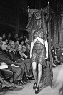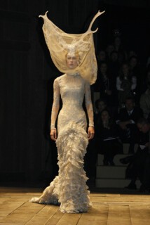 Haute couture has always been intertwined with exquisite stitching and other handiwork, and the new promotion of fashion as a fine art has been given ballast by the Metropolitan Museum’s Costume Institute. The ambition to be an artist, which is so evident in McQueen’s runway shows and strongly brought out by the performance-cum-installation of the luxurious mise-en-scène at the V&A, has also found support in the rise of the handmade as a value for artists – though the latter are sensitive about the label ‘craftsman’. Ruskinian theories are returning, and William Morris has been adopted as a hero by Jeremy Deller, who juxtaposed him admiringly with Andy Warhol in Love Is Enough, the show he curated recently at Modern Art Oxford. Couture perfectionism and beauty, especially when defaced and slashed and paint-splattered and generally savaged in one of McQueen’s fits of potlatch craziness, belongs in this part of the aesthetic spectrum, which is now acquiring higher status, alongside Grayson Perry’s pots and tapestries, Rachel Kneebone’s ceramic figures, or Polly Morgan’s taxidermy sculptures.
