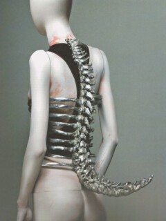 The sculptor Louise Bourgeois once said: ‘When I want to repair something I stitch it. When I want to destroy it, I cut it.’ The lumpy stuffed mannikins that she made reveal how eloquent these processes are: the slashes are violent, the suturing a gesture against further damage. McQueen himself was preoccupied with insides and injuries: anatomical figures made of wax inspired him, and the array of artefacts in the exhibition’s cabinet of curiosities includes jewellery in the form of vertebrae. The gleaming alcoves, floor to ceiling, are filled with the body armour and other pieces, many of them close to implements of torture, that the goldsmith Shaun Leane made to McQueen’s designs. The overall effect recalls a cathedral treasury in Spain, filled with reliquaries, gems, gold, disquieting and dazzling things.