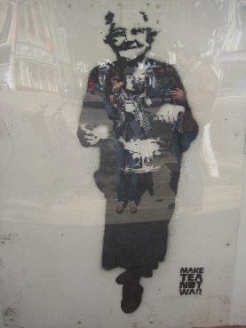 Here's a clearer image, without the Plexiglas. (Click through for detail.) I agree with AJP still, though, that this is not as lucidly drawn as a good Banksy stencil -- whatever that is between her chin and the teapot is a muddle.