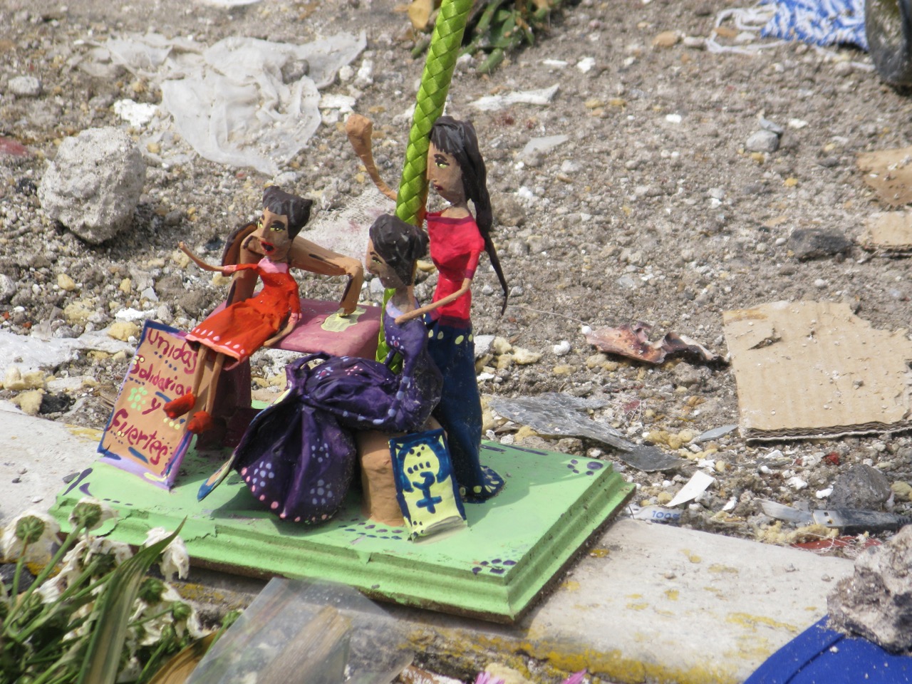 An image of the Virgin of Guadalupe (invoked by several recent popes as Queen of Mexico and Patroness of the Americas) was propped up on a mound of rubble in the wasteland strewn with clothing, lengths of fabric and bunches of flowers. Two funeral wreaths stood forlornly. A white papier-mâché dummy could have been the ghost of a seamstress. There were dozens of stacked buckets, which had been used by volunteers to move the rubble.