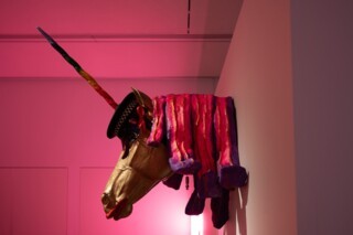 The final room was dominated by a giant wooden unicorn, Destiny, designed by Becky Minto and made by Scott Bisset from reclaimed timber, with lighting design by Kate Bonney. When you walked inside it, you discovered everyday objects – rainbow shirts, trail shoes from a queer running club – that the museum has collected from LGBTQIA+ groups in and around Perth. At one level, Destiny skewers transphobic stories propagated by the right-wing press, with unfounded claims about ‘Trojan horses’. The jumble of objects inside also hints at those cabinets of wonder. But the real force of the piece came from the contrast in scale between the towering exterior and the mundane, material traces of human work suspended inside.