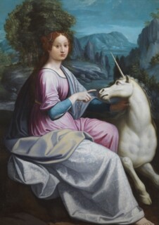 Renaissance painters moved away from the unicorn as a religious icon and instead toyed with the phallic allegorical potential of its horn in depictions of chastity. A full-length portrait by Luca Longhi, produced between 1535 and 1540, shows a person believed to be Giulia Farnese, lover of pope Alexander VI. She is resting on a riverbank, draped in dusty pinks and pale blues, a unicorn at her side. She presses her thumb against the creature’s jugular, and it submits to her control, while the finger of her free hand points to its muzzle. There’s a gestural boldness to the composition, as if Farnese is daring us to repeat the rumours we might have heard, and to defy this evidence of her purity.