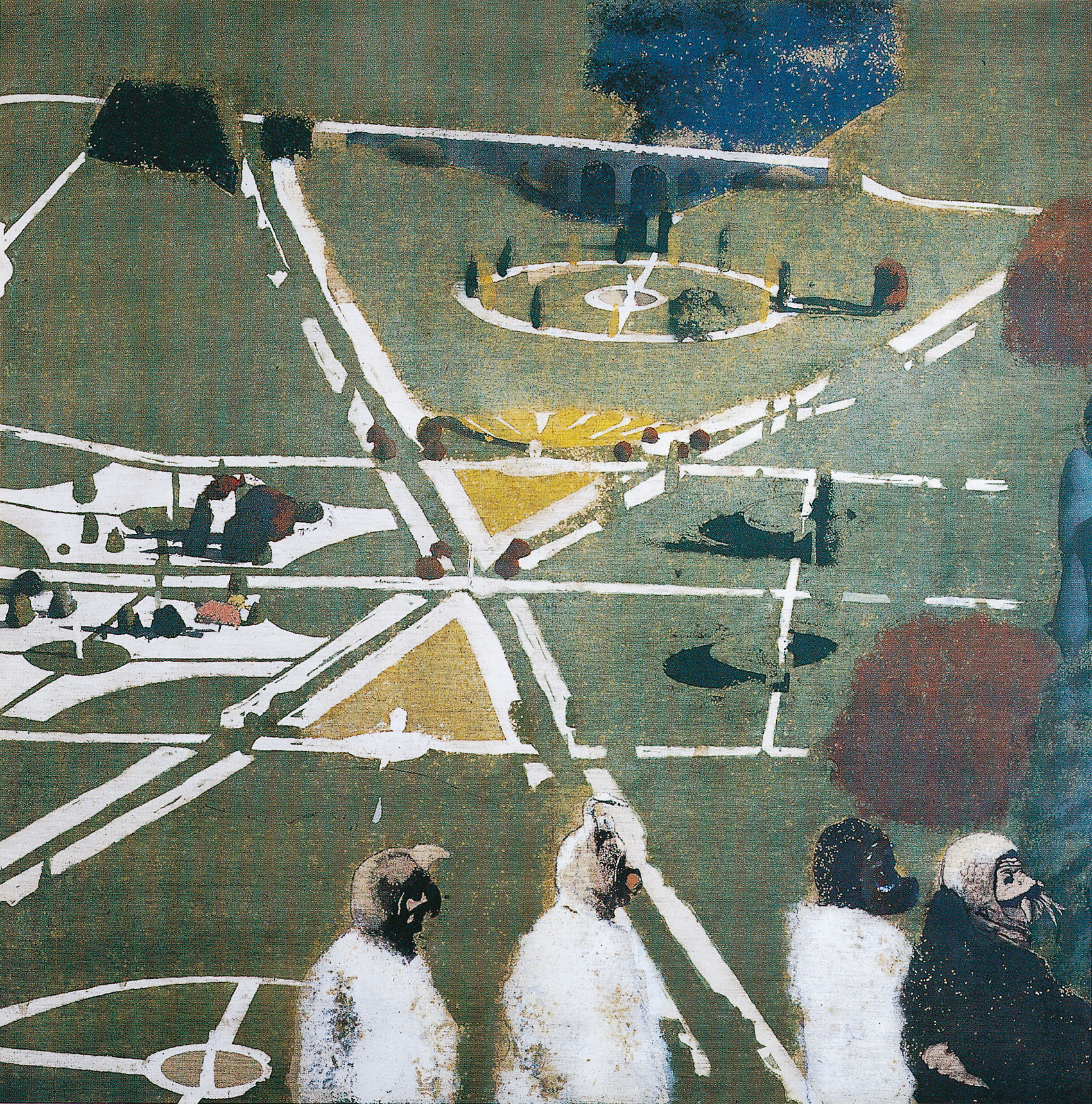 Andrews’s pictures are like disturbing dreams. It’s not just the intrusions – such as that of curious animal-masked figures in the foreground of views of the formal gardens of Drummond Castle. There is something grey, threatening and unexplained about his blandest landscapes. Ayres Rock is a discomfiting presence despite the bright desert light; the water in which he teaches his daughter to swim is threateningly black; in the stalking pictures it is the distant deer that first catch your eye, the prone figures who hunt them hunt you too. These effects are made stronger when you see the pictures together because Andrews employed no recognisable single way of making marks which would let you live, as it were, in the painter’s hand and eye. There is air-brushing, neat small-brush painting and, sometimes on the same canvas, there are broad painterly strokes – like the ones in A View from Uamh Mhor which describe the nearer hillsides. On that canvas and on Edinburgh (Old Town), streaks of thin paint drip down the picture over bare patches which look as though they are waiting to be finished (but which would resolve things altogether too much if they were). There are small studies close in appearance to Constable sketches. Sometimes the canvas is primed, sometimes bare brown linen shows through. His life’s work reads as a calculated attempt to avoid a style which would have a life of its own, and you finish up not knowing who, as a painter, he is.