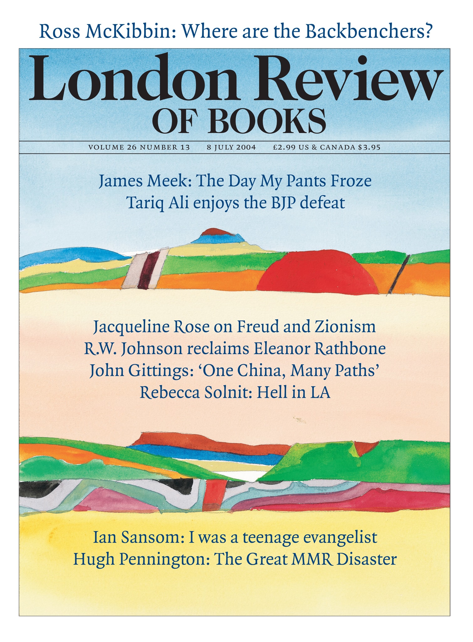 The greatest sacrifice the people are being asked to make on behalf of the state is to give up their right not to believe in it. If there is one thing worse than disillusionment, it is not being allowed to recognise that you are disillusioned. (As Winnicott once said, it doesn’t matter what a child feels provided they are allowed to feel it.) There is a lie at the heart of democracy if the state will sacrifice its citizens’ freedom to take dissent to the limit, and indeed its relationship to them, for the sake of its own violently enacted and no less violently preserved self-regard. Tony Blair’s increasingly desperate statements of conviction would then simply be an inflated example of the trend. ‘I believe in myself’ is the last great performative statement of an idealist on the rocks. It also exposes the lie since, believing in himself and himself alone, he clearly neither believes in, nor belongs to, the people. Righteousness is then a flag of honour that leads a nation to war. ‘It is crucial,’ Winnicott argued in his 1940 paper ‘Discussion of War Aims’, that ‘we should win a military and not a moral victory’: ‘If we fight to exist we do not claim to be better than our enemies.’ How many times have we been told in the past few weeks, as though it should make us feel better, that what was done in Abu Ghraib is nothing compared to the executions and tortures of Saddam Hussein. As Ahdaf Soueif put it in a recent article in the Guardian: ‘Hussein is now the moral compass of the West.’