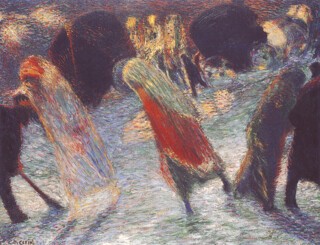 In the earlier work in the show painters stared at the city at night, at its shadowy corners and its blurred, bright entertainments. The results were enlivening. Edvard Munch’s The Day After of 1895 would be a piece of moralising were it not for the way brush strokes seem to carve the girl sleeping off a hangover out of something thicker and more oppressive than air. While George Bellows’s 1924 picture of a boxing match is lively, populist documentary, Carlo Carrà’s Leaving the Theatre of 1909 already gives a radical account of appearance: feathery marks are woven into bright cocoons of colour which allow you to sustain for minutes an instant impression, a glance.