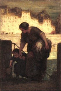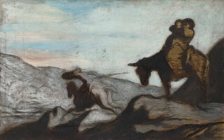 Stand far enough back, and the image just about recomposes into another inclination in space, another way a figural mass might suggest a city or a terrain around itself. Elsewhere, it might be a heavy-burdened laundrywoman and her small daughter crystallising the quaysides of the Seine, or a hovering-to-pounce collector leafing through a portfolio in a print shop. (Catherine Lampert and Ann Dumas, the exhibition’s curators, have shrewdly foregrounded the genial art-world banter in Daumier’s wide subject range, rather than, say, his sneers at 19th-century feminism.) Daumier’s figures summon up times as well as spaces: none more so than the railway passenger looking out of a window in A Third-Class Carriage, man and window effectively devising a visual character for modernity through their stark receding repetitions. Alternately, there are his melancholy, self-referential pasts: the old street clowns whom no one still cares to watch, or Don Quixote and Sancho Panza, forlorn spirit and squat flesh, adrift in a Parisian’s fantasy of desert Spain.