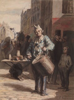 In between, Daumier’s mind-sculptures exchanged weight for dynamism. The Fugitives relief of 1848 or thereabouts shows the heroic nude entering his repertoire: in no way a careerist yet dreamily ambitious, he would have drunk up the comparisons to Michelangelo that critics have since invoked. But already he was looking beyond that schema, starting to conceive each figure as a verb (climb, carry, fall etc): an inclination in space given transient visibility. Wonderful pen drawings from his middle age bring out the attitudes of clowns or lawyers from seedbeds of freely wandering line, wash being gently applied to the paper wherever body volume or body interactions suggest themselves. He seems to home in unerringly on those inner prototypes, so sure in poise, so empathetically inhabited.