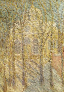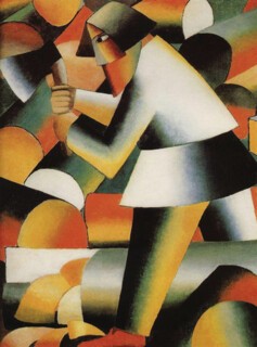 Born into a Polish family in Kiev in 1879, Malevich learned to paint in his teens, though nothing seems to remain from that time (so there is at least one Malevich we can’t now see). His first exhibition was in 1898 in Kursk, where he was working as a railway draughtsman, but the earliest piece on show here is a portrait of his father from 1902-03. On his first trip to Moscow in 1904, Malevich saw the Monets and Cézannes adorning the mansions of the wealthy merchants Ivan Morozov and Sergei Shchukin. In the years following, he made the journey from Post-Impressionism and Symbolism through Fauvism, primitivism and Cubism to abstraction, absorbing the lessons of each with a thoroughness that seems chameleonic: from the stippled clots of paint disclosing a Church (c.1905) to the Klimt-esque Shroud of Christ (1908); from the sensuous fluidity of the Self-Portrait (1908-10), which would recall Gauguin were it not for Malevich’s unmistakeable blunt stare, to the green-grey tones – Malevich later called it ‘Cézannism’ – of Landscape (1911). The succession of idioms is striking for its speed: months separate the folkloric primitivism of Floor Polishers (1911-12) and the Cubist dissection of space in Head of a Peasant Girl (1912). With The Woodcutter and Peasant Women in Church (both 1912), two phases share a canvas: on the front, the axe-bearing subject is broken into volumetric blocks, surrounded by curves and planes of colour; on the back, crudely formed faces and bodies crowd the frame, impoverished cousins of the Demoiselles d’Avignon.