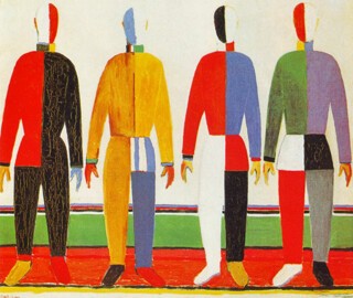 By the mid-1920s, the impasse was not purely aesthetic: officials and critics attacked abstraction as reactionary ‘formalism’, and in 1926 Malevich was dismissed from his post at Leningrad’s State Institute of Artistic Culture. A three-month trip to the West in 1927 didn’t produce the Bauhaus teaching job he had hoped for. On his return, Malevich began going over his entire oeuvre, ‘repainting’ early themes and backdating them – often seen as a clumsy attempt to bulk up his back catalogue with representational subjects. But Malevich’s turn to figuration was far weirder than the simple surrender to Stalinism it was once taken for. In the late works, different styles coexist, often within a single canvas. The blank, brightly coloured mannequins of Sportsmen (1930-31) and Woman with a Rake (1930-32) recall the designs for Victory over the Sun; there are echoes of his Cubist phase in the segmented faces and bodies of Carpenter and Head of a Peasant (both 1928-29); and a new motif, the landscape – the fields and plains of his youth? – appears as serried rows of colour marching to a low horizon.