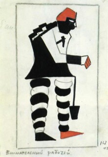 The possibility of paring down pictorial elements into abstract forms was latent in Cubism itself; but in Malevich’s case, the process received two further jolts. Both derived from his proximity to the poetic avant-garde – the ‘transrational’ verse of Aleksei Kruchenykh and others, who sought to break through to some higher meaning by returning to word-fragments and phonemes their original power. In illustrations Malevich made to accompany their compositions, letters or punctuation marks jostle with lines and shard-like shapes. The dissolution of established meanings was also behind the absurd juxtapositions of Malevich’s ‘alogist’ works, such as Cow and Violin (1913). In Lady at the Advertising Column (1914), floating signs appear among colourful geometric forms that clearly prophesy Suprematism.