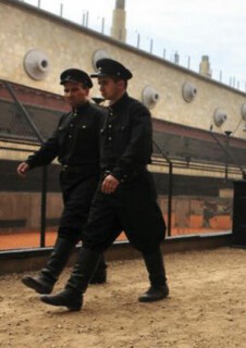 Khrzhanovsky’s response to the grandeur of the material was Soviet in scale, both in the expenditure and in the degree of control he exercised over individuals’ lives. The Institute was built in Kharkiv’s derelict outdoor swimming pool complex, which offered a natural courtyard surrounded by low Stalin-era buildings. The few journalists permitted to visit, and the handful of low-resolution pictures circulating, describe an establishment with 250 production staff and fifty full-time in-character residents. Passage from modernity into the reconstructed Soviet world was permitted only to those in costume; the perimeter was patrolled by guards in Soviet uniform. The period core of the Institute resounded with modernist string music broadcast from loudspeakers, even in the middle of the night, and smelled of pigs from the Institute’s own pig farm. Surreal neo-Soviet sculptural forms, such as never actually adorned Stalinist buildings, loomed over the courtyard: a version of Lenin’s mausoleum, disembodied forearms projecting from walls clasping a hammer, a sickle, a brain.