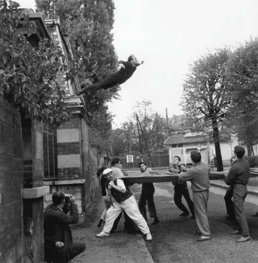 Close by the picture in the Tate exhibit is a photograph that debunks the whole thing (above). The jump, of course, was tightly stage-managed: in real life, a group of his friends held out a tarpaulin to catch him as he fell. The famous image – unexplained for forty years – is a photomontage made in the darkroom by Harry Shunk and János Kender, as was eventually revealed when their working materials made their way into the Roy Lichtenstein archives after Shunk died. In one shot, Klein hovering above the outstretched tarpaulin; in the other, the Paris street with the cyclist drifting by, minus the tarpaulin and team of nervous assistants. The final photograph is an act of trickery – a performance created for the camera. The Tate show traces a series of performance acts, images made for various reasons: as validations of existence, as acts of playfulness, as political statements.