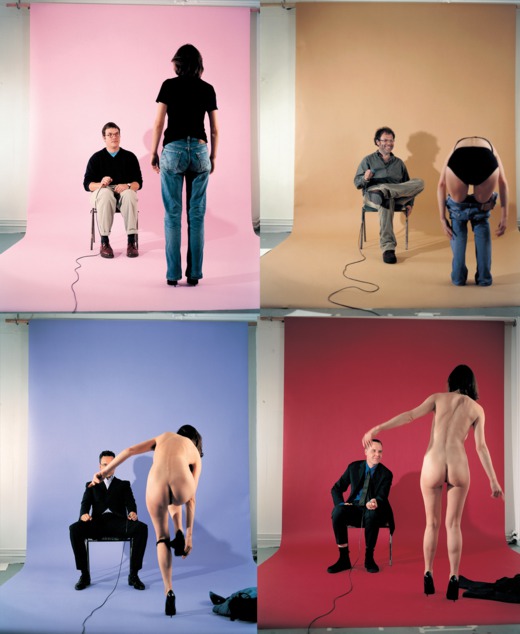 Women are often objects in this show, but they are also in charge of the images, controlling the way they are seen. In STRIP [Writer, Critic, Dealer, Curator, Critic, Writer] (1999-2000), Jemima Stehli takes her clothes off in front of a series of influential men from the art world (below). She has her back to the camera so that we see her strip off from behind – pull down her jeans, step out of her knickers, until she is standing naked in just her high-heeled black shoes. It is the watching men – their expressions, their body language and how it changes as Stehli removes each bit of clothing – who are the focus here, from the dealer who sits with his legs wide apart, deep in concentration, to the writer who sits with his knees together, a nervous look on his face. The men look worried, amused, confident, awkward, interested, fake-relaxed. It’s fascinating and terrible to witness.