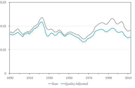 The graph shows how Philippon’s estimate of the unit cost of financial intermediation fluctuates through time. It rises to a first main peak during the financial excesses of the 1920s, falls during the middle decades of the 20th century, then rapidly increases again. The unit cost has come down a little in recent years, but only to roughly its level in the late 1880s. (The lower line in the graph is Philippon’s estimate of the unit cost corrected for the changing aggregate level of the difficulty of the task of intermediation. For example, investing wisely in start-ups involves more screening and monitoring – and is thus intrinsically more expensive – than buying the shares of established corporations with lengthy track records; while making a single big loan to a wealthy household is cheaper per dollar lent than making multiple smaller loans to less well-to-do households. However, adjusting the unit cost of intermediation to take this into account produces an only slightly improved picture of change through time.)