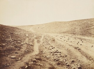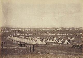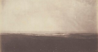 All considered, his achievement was immense. Fenton disapproved of the barren scenery, but his photographs are bleakly beautiful: his view of besieged Sebastopol, with its wash of grey sky over a stack of black landscape, is reminiscent of Caspar David Friedrich, the town at its centre tiny, visible only in matchstick detail. Elsewhere Crimea, under the unforgiving sun, is rendered lunar, or Martian – pitted, rubbly, leached of shade, the scrub on the cliffs like spotted mould. Fenton made an accomplished panorama of the British camp in 11 parts, splitting space and re-assembling it again in a series of crab-like movements: thousands of tents are scattered over the plain, the sky is vast and seems to touch the ground (a result of a flaw in his process, which fogs the surrounding hills), the soldiers are like toy versions of themselves, planted in their places.