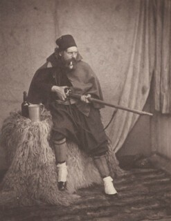 There are two portraits Roger Fenton took of himself, separated by only a year, one of them in the exhibition of his photographs of the Crimean War at the Queen’s Gallery in Edinburgh (until 26 November) and the other not. The first, from 1854, seems conventional: we see a Victorian gentleman – hair parted, beard trimmed to cover only the underside of his face, leaving the strong chin to fight its own battles – seated in a chair, his arm resting on a covered table. But then we notice the strange two-tone geometry of his outfit, the way the vertical stripes on his trousers connect with the diagonals on his waistcoat, themselves repeated in the pattern of his necktie, all of it framed and contained by the black of his frock coat, offset by the white of his hands and face. We pick up, too, on the assertion: Fenton fills most of the available space, there is confidence in his composed features and concentrated gaze, in his spread legs, in the discernible bulge in his crotch. It is an advertisement for himself, for his skill at managing effects, and for the medium, then only about fifteen years old. The second self-portrait, one of the first photographs you encounter in the exhibition, is different and not. Fenton is half-seated on a table covered in a sheepskin rug and supporting a bottle of beer and a tankard; a rifle is cocked in his hands and pointed out to the right of the frame. He is wearing the uniform of a Zouave, a French infantry regiment famous for its élan and baggy red trousers; he now has a full beard, his gaze follows the line of the gun, and there’s a pipe clamped between his teeth. It is 1855, and Fenton has returned from the Crimea, where the war is still going on. The photo was taken in his London studio – a dirty sheet has been hung on the wall and a rug laid on the floor to cover the inauthenticity – but it was blandly titled A Zouave and slipped in with the nearly 350 genuine images from the war Fenton exhibited to an eager public in thirty venues over the course of the following year. There was no apparent guilt about this deception, no winking admission, at least in public: Fenton simply wanted to play a part in the story.