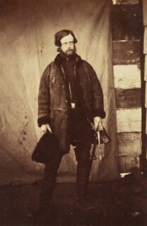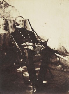 What makes Fenton’s photographs interesting to look at, besides the obvious, is his strong awareness of the limitations of his medium, and his ability to turn these into strengths. He sought out contrasts (rendered particularly sharp by the albumen paper he generally printed them on), knowing that canvas tents would glow white in developed photographs, providing a clarifying background for the human figure and lifting landscapes. This awareness also informed his compositions. Valley of the Shadow of Death, a photograph of a ravine filled with Russian cannonballs, is built out of intersecting lines in subtly differing tones of grey: track marks wind up to the sky, the brows and slopes of the hills seem to interlock, meeting and continuing on from each other. The balls in the foreground are silvery, blending with the rocky ground; those further out are darker, defined by deadly intent. But what most struck me at the show – it doesn’t at all translate onto the printed page, with its flattening effect, so you will have to take my word for it – was the camera’s brilliance at representing texture, clothes especially. As in painting, the effect is achieved through exaggerated attention: its contrasts of light and dark accentuate the folds in trousers, the ripple of silk, the bristle of tweed. Most dazzling and unexpected are Colonel Adye’s boots, which gleam like wet ink: in Fenton’s portrait the light pours slickly down the leather, welling in its creases.