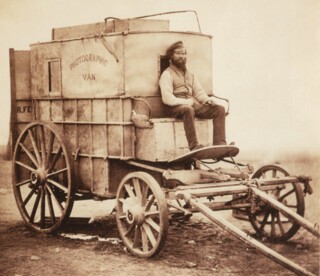 The camera transformed, but not without difficulty. Fenton landed at Balaclava with five cameras in different sizes, seven hundred glass plates in three sizes, two assistants in two sizes and a battery of chemicals, packed in 36 chests. A founder of the Royal Photographic Society as well as its first honorary secretary, he was a practitioner of the wet collodion process, then only four years old. To take a photograph he coated a glass plate in collodion (cellulose nitrate mixed with alcohol and ether) and sensitised it in a silver salt solution; next he slotted it into his camera and, when he was ready, exposed it to light (exposure times were normally between seven and twenty seconds, no longer the several minutes of persistent belief). The photo had to be developed almost immediately, before the collodion dried, so a darkroom had to be close at hand. In the Crimea this took the form of a repurposed wine merchant’s van (something else Fenton brought with him): a photo of it is included in the exhibition, taken at the insistence of Fenton’s chief assistant Marcus Sparling, ‘as there was a possibility of a stop being put … to the further travels of both the vehicle and its driver’. It is a heroic image, in its way: Sparling, in the driver’s seat, seems half-proud of the absurdity of his situation. The van has a certain pride too: it looks as though it has been hammered together by Ned Kelly, and indeed it had been given a new roof and windows, as well as a retrofitted interior. It – and Fenton’s bulky equipment – made them frequent targets for enemy fire. More troublesome was the fierce heat that had succeeded an iron winter: already in March, the month of Fenton’s arrival, William Russell of the Times was cursing the hand-knitted mittens still arriving in their thousands from worried mothers. The rising temperatures interfered disastrously with the chemicals, necessitating longer exposure times, cooking the nitrate, drying out the plates as they were carried between camera and van (which soon needed to be kept within one hundred yards) and creating streaks and smears on their surfaces. By June the van was a furnace, Fenton was complaining of ‘stoppers flying out of my bottles’ and such was the glare that he couldn’t take any photographs after 10 a.m.