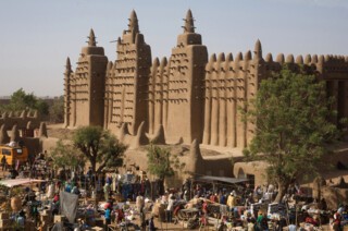 Historians hate the use of the term ‘medieval’ to describe periods or places outside Europe, but I found it hard to avoid when I walked through the maze of lanes running between the grand patrician houses in the best part of town, most of them set near open crossroads that look like clearings in an adobe forest. The two main streets, at right angles to each other, meet at the marketplace in front of the ‘great mosque’, a vast edifice with room for more than five thousand worshippers. In 1988 Djenné became a Unesco World Heritage Site. The extraordinary mosque – said to be the biggest mudbrick building in the world – was the main draw for tourists.
