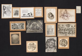 Nearly all the panels feature human figures, or gods that resemble humans, or human-animal hybrids. The mood swings between ecstasy and melancholy, undercut by currents of violence. Panel 41a features more than a dozen representations of Laocoön, the Trojan priest who was strangled to death, along with his sons, by two immense sea serpents – a punishment from Athena for warning the Trojans about the wooden horse. The Laocoön sculpture excavated in Rome in 1509 isn’t depicted: Warburg wanted to show that ‘if the Laocoön hadn’t been excavated, [the people of the Renaissance] would have had to invent it.’ One engraving shows Laocoön standing with arms raised as he fights off the snakes; in others he’s seated, contorted in pain. His expression ranges from fury to despair to restraint or resignation. Warburg was greatly influenced by Gotthold Lessing’s essay on Laocoön, the central text of the German Enlightenment, and particularly by the idea that an emotion such as agony could be represented in a range of modes. He gave the name Pathosformeln to the recurring gestures, or symptoms, that carve a path of social memory across different forms of representation: a certain pose, say, migrating from a tomb carving to a postage stamp. Images were, he thought, uniquely expressive of emotional undercurrents often lost to textual history.