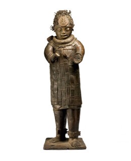 The most extraordinary objects in the show were made in West Africa itself. Several are on loan from the Nigerian National Commission for Museums and Monuments, including the group of ninth or tenth-century copper items discovered at Igbo Ukwu between 1959 and 1964. The excavations revealed around 685 objects across three sites. Particularly remarkable is a large copper-alloy pot. Its trumpet-shaped foot, decorated with alternating blind and open swirling motifs, is the pedestal to a vase, rounded at its centre like an ostrich egg, which curves upwards into a thin but broad rim. A rope of bronze hangs loosely around it, tied at various points in double knots to form an outer openwork shell. The virtuosity is breathtaking and predates anything in Europe approaching its sophistication: Abbot Bernward’s bronze doors for Hildesheim Dom, for example, were commissioned only around 1015. The pot from Igbo Ukwu required three castings to achieve its final form. First, using the lost-wax method, the pot and stand were made as a single piece. The rope-work outer shell and additions were separately cast and then all the parts fused in a third casting, where, unusually, new wax elements were applied to the almost finished bronze. Then, in a high-risk finale, the whole piece was encased in clay and placed in the forge.