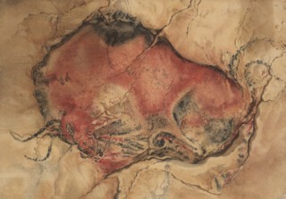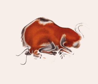 Prehistomania encourages viewers to celebrate the variety and mystery of parietal art. But it still can’t separate our aesthetic appreciation of the images from the role they have played in modernity, and very few of us will ever see the originals: the decisions of photographers and copyists, of archaeologists who brightened paintings with water and removed impurities from the cave wall, have all played a part in shaping our perception. To prepare his relevés, Breuil would put a sheet over the originals and copy them in outline, then abstract the copies across several drafts, removing evidence of the wall’s texture and cracks, accentuating stylistic elements. In one of the bison pictures at Altamira, the cave painters had used a bulge in the rock to convey the creature’s massive shoulder. The shape of the wall gave it heft. Breuil’s two-dimensional, abstracted bison does away with this, leaving us to speculate about a symbol rather than a composition. Katharina Marr, who copied the same bison, took pains instead to show the way the original painters had used the surface. In her relevé we can see that the bison’s back and head have been modelled precisely along a jagged wall crack: the shape of the wall is now part of the animal. Marr’s meticulous reconstruction makes the bison feel as though it’s not only breathing with the rock but actively trapped by it.