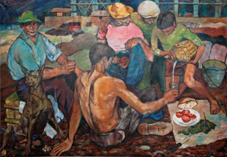 For most of the two hundred pages of part two, ‘The Boy Pouring Water’, the narrator, aged ten, is posing as an artist’s model for one of the figures in his father’s masterpiece, I bevitori, an enormous canvas – though not literally a canvas, since it’s painted on one of Rusinè’s best bedsheets – showing four workmen on a building site pausing for their midday meal. Federico says it’s a homage to (or reinterpretation of) Manet’s Déjeuner sur l’herbe, transposed from a bourgeois to a proletarian setting. Velázquez’s Triumph of Bacchus (or Los borrachos) is another antecedent. The influence of Cézanne – once reviled by Federico, later embraced – is perhaps visible in it too. But the narrator, and the novel, are more interested in the painter’s human models: the uncle who posed for the figure sitting on a crate on the left of the picture, sleeves rolled up, glass in hand, mastiff beside him, both man and dog looking out at the viewer; Luigi, an itinerant fruit and vegetable seller, shown sitting shirtless on the ground in the middle of the image, his back to the viewer as he holds out a glass to be filled by the boy pouring water from a heavy demijohn. Federico complains endlessly about how hopeless the men are, unable to sit still, and Mimí is determined to do better than them, not to let his father down, despite the discomfort of the pose his father puts him in, the pain it causes in his knee.