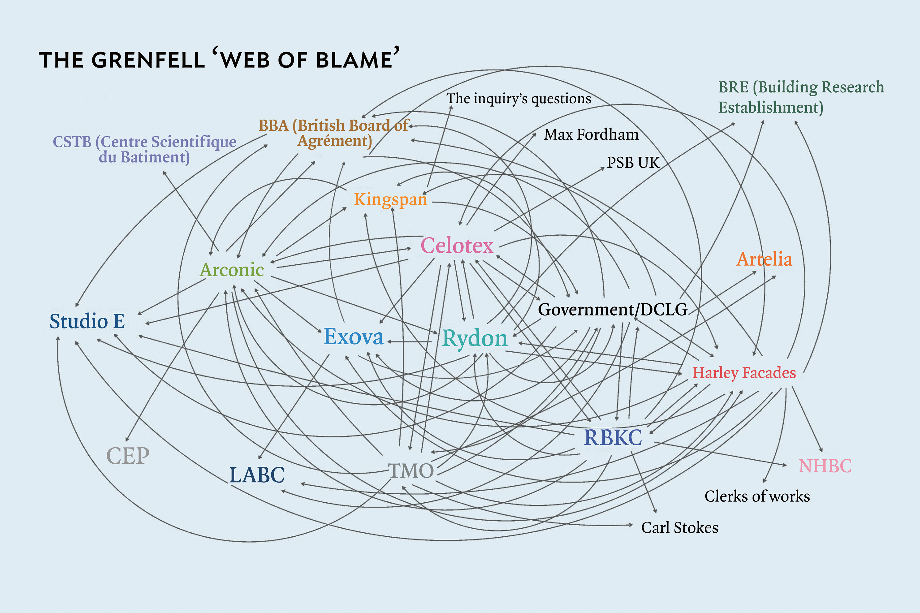 In his closing statement, Richard Millett, lead counsel for the inquiry – responsible for examining all the witnesses and ensuring its terms of reference were addressed – presented a ‘spider’s web of blame’: the image showed a tangle of arrows going between Kensington and Chelsea Council, testing bodies, architects, manufacturers and construction companies. It’s almost impossible to decipher, and that was his point: each arrow represented one party’s attempt to shift responsibility to another and back again – a sorry repetition of the ‘merry-go-round of buck-passing’ that Millett argued had characterised the first phase of the inquiry. In countries with sophisticated regulatory regimes, catastrophes such as Grenfell ought to be impossible: when they occur they are invariably multi-causal, the result of many overlapping failures. This complexity is often taken to be exculpatory and used by guilty parties to muddy the issue of responsibility. Lawyers for the bereaved asked the inquiry not to get entangled in this web, but instead to begin to apportion the degree of responsibility borne by the various parties. The final report assigns ‘considerable’ or ‘very significant’ responsibility for the fire to the contractors and subcontractors who executed the refurbishment.