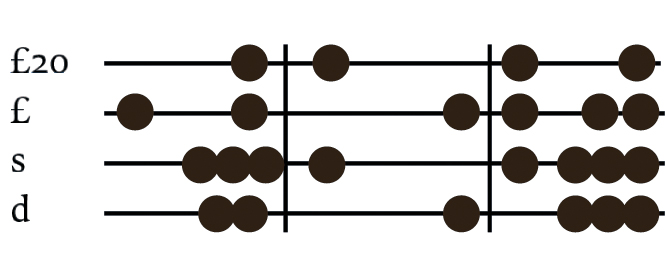 In the diagram here, the left column shows £26, 3s, 2d added to the central column of £101, 5s, 1d, to generate a total in the right column of £127, 8s, 3d. Though it seems finicky, it was (apparently) intuitive and highly flexible. The horizontal lines could be adapted to mean whatever the calculator wanted, allowing arithmetic between the mix of base-twelve (pence in the shilling) and base-twenty (shillings in the pound) systems of English money.