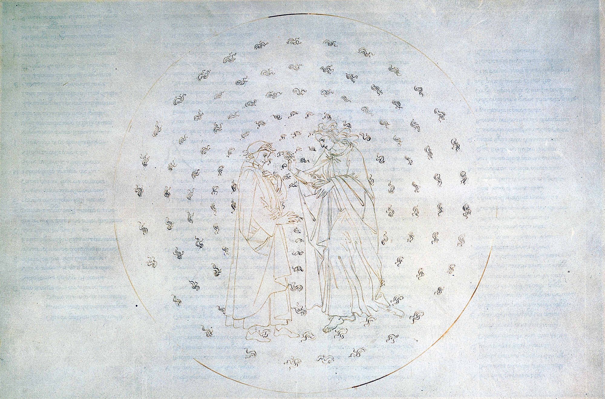 He excels against the odds. In Paradise, for the most part, the illustrations stick fast to Dante and Beatrice, with very little else to tell us where they are or what they might be about. In Canto i we see them rise from a circle of Edenic saplings towards the heaven of fire. From Canto v, they are the only human forms in prospect. As their ascent continues through the planetary spheres, the occupants of heaven assume the guise of small, decorative flames marshalled in concentric rings. The couple gaze on. They advance or recoil in ecstasy; they float or come to rest, like exquisite mime artists, reacting to beings and contingencies which to us are matters of conjecture. It’s not until Canto xxi that the emblematic flame-creatures surrounding them like votive lamps are replaced by small, putto-like figures, with limbs and so on, sailing weightlessly beside the base of Jacob’s Ladder.