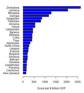 On the Beeb’s wrap-around coverage, the fortunes of Team GB athletes are brooded over in the longueurs between the action and the fillers. In the studio, Sue, Gary and the rest struggle to drum up interest in the unicycle slalom or the Belgium-North Korea face-off in the mud-wrestling, with poolside filler-bites from breathless paddlers and the odd noddy with normals. At the time of writing, ‘we’ have surged up the gong-heap after bagging another six golds on day nine, with commentators in the Mail and elsewhere quick to point out that, per head of population, Britain is doing better than China and the US. But there’s more than one way to manipulate the figures. A GDP-per-capita-adjusted table for the top 25 medal-tallies amassed by the end of the 2008 games, using a Borda Count-style scoring for different medals (3 for gold, 2 for silver, 1 for bronze) makes interesting reading: