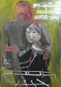 Boats appear in many of Nave’s paintings, and seem to symbolise for him the possibility of change. In My Ego and Me, the haunting but surprisingly un-despairing figures are foregrounded by an empty boat with four white oars. When I asked Nave about the recurring boat imagery in his work, he said: ‘It could be a flight fantasy, or the condition of possibility of creating something new, or maybe both.’