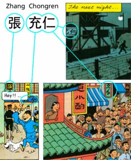 When I first read the story, I was interested by the profusion of Chinese writing in signs, wall-hangings, posters, graffiti, and occasionally speech bubbles. What did they say? Or were they merely random characters included for atmospheric effect? I later learned some Chinese, and found that they were intelligible. Some characters in the larger banners may have been copied by Hergé or a studio assistant, but the smaller texts are written with such assurance that the hand must be Zhang’s. In three places his personal name 充仁 (Chongren) appears as a cryptic signature, partly obscured, on signs in the background, once next to the character 張, Zhang, his family name.