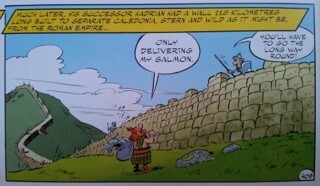 An Asterix adventure in Scotland wouldn't be complete without a reference to Hadrian’s Wall, but rather than working it into the story (in Asterix and Cleopatra, Obelix climbs on the Sphinx and knocks its nose off) or making it a throwaway joke (crossing the Thames in Asterix in Britain, Obelix says: ‘I think this bridge is falling down’), Ferri and Conrad just give the wall an extraneous panel to itself a few pages from the end, like a tired afterthought.