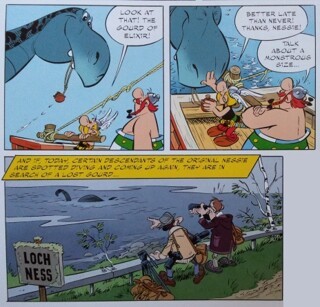 There's a running gag in The Chieftain’s Shield that ‘no one even knows where Alesia is.’ This is now true, though it wouldn’t have been in 50 BC. As in The Flintstones, a lot of the jokes in Asterix rely on anachronisms. In Asterix in Britain there are ox-drawn double-decker buses, pubs with dartboards, the Beatles (‘a very popular group, they're top of the bardic charts’) and a rugby game. In Asterix and the Picts there’s a goofy Loch Ness monster (which makes far too many appearances), whisky, ‘a Loch Androll tune played by our bards’ and caber-tossing.