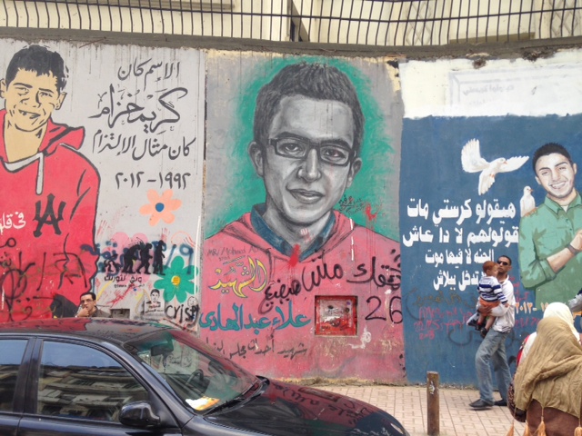 I also took a few pictures of the wall of the university on Mohamed Mahmoud. For two years it has been covered with a series changing murals, memorialising the dead as they fall: football fans, Coptic protesters, a professor from al-Azhar University. Some were portrayed as angels; some as figures in ancient Egyptian friezes. There were even strangely beautiful portraits of the battered faces of famous victims. Twenty-four hours later the entire wall had been covered with an ugly red-and-pink camouflage pattern.