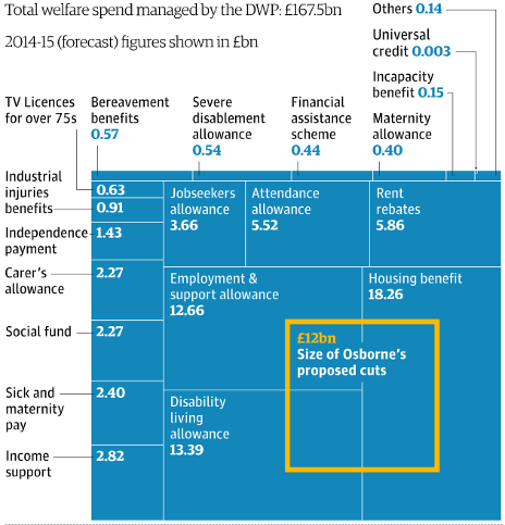The detail about this increased spending is generous. The detail about how it’s going to be paid for is less so. The cap on the amount of benefit received by a household is being lowered from £23,000 p.a. to £21,000. You would be forgiven for thinking that this will pay for everything, because it’s the only specific cut that is mentioned. Elsewhere there’s a promise, repeating something previously asserted by George Osborne, that the Tories will find £12 billion in ‘welfare savings’, added to another £13 billion in cuts in departmental spending. James Ball at the Guardian has made a vivid chart of what that ongoing £12 billion cut looks like: