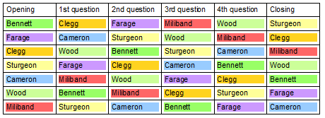 Tonight’s seven-way leaders’ debate is going to make for a bizarre couple of hours’ telly. The format goes like this: there will be an opening statement by each of the seven party leaders. Then themoderator asks all of them a question to which they each give a one-minute answer, followed by an 18-minute free-for-all debate. Repeat for a total of four moderator's questions, 28 replies, andfour free-for-alls. Then closing statements from all seven leaders in turn. Here’s the sequence: