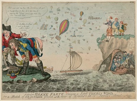 Maurois would go on to write about a real war in Why France Fell (1941), but his fictional divide according to girth wasn't so new. In Bonaparte and the British: Prints and Propaganda in the Age of Napoleon, a cartoon showat the British Museum, Bonaparte is often 'Bony' or 'Boney', while John Bull is forever a Fattypuff. Even when the British aren't depicted as John-Bull fat they're still at it, eating and drinking,drinking and eating, always maintaining their own heavy but even keel. In Gillray's John Bull taking a Luncheon an enormous Bull feasts on French battleships served to him by thecommanders who had defeated Napoleon in the Mediterranean. Bonaparte by contrast is not only typically thin, but often ill. In a cartoon by Isaac Cruikshank he stands on the Pas de Calais, vomitingat one end, farting at the other: the caption is 'Bonne Farte Raising a Southerly Wind'.