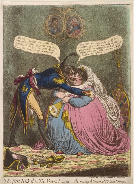 It's not only John Bull who is fat; so is Britannia. In The First Kiss this Ten Years, the cartoon made by Gillray to mark the halt in the Anglo-French wars after the Treaty of Amiens(1802), a thin Napoleon stoops to kiss a spherical Britannia. 'Madame,' he says, 'permit to me pay my profound esteem to your engaging person, and to seal on your divine lips my everlastingattachment.' 'Monsieur,' she replies, 'you are truly a well-bred gentleman, and though you make me blush, yet you kiss so delicately that I cannot refuse you, though I was sure you would deceive meagain.' In an anonymous print of 1803, Napoleon is depicted as man who has tried to swallow the whole world, only the globe has got stuck in his mouth.