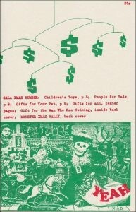 There are ten issues, of various lengths, with contributions by Yevgeny Yevtushenko, Alan Sillitoe, and other knowns and unknowns. (Robert Murray’s ‘Poem I’, in Yeah #4, reads, in its entirety: ‘Sure I scream./Why not?’) By the eighth issue, Kupferberg was doing all the work, which consisted, now, of freestanding inserts, cut-and-paste collages, repurposed headlines, appropriated comics, ads, and articles drawn from other publications. He called the effort ‘a satyric excursion’, but the warmongers, white supremacists and capitalist crooks that he targets are real, as are the raw materials. ‘This shit, you can’t make it up on your own,’ each issue says, in so many words and illustrations.